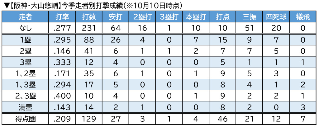 巨人との3連戦から始まる今週もその“勢い”に期待したいが、その復調ぶりとともにもうひとつ“改善”すべき点が、チャンスでのバッティングだ。今季の大山の走者別の打撃成績を見ると、走者なし時が打率.277に対し、得点圏では打率.209と急降下。満塁では打率.143と力を発揮できていない。だが、9月以降の調子急上昇は当然、得点圏打率上昇にもつながる。4番がチャンスで打てるかどうかで、チームの勝敗は大きく変わるはずだ。
