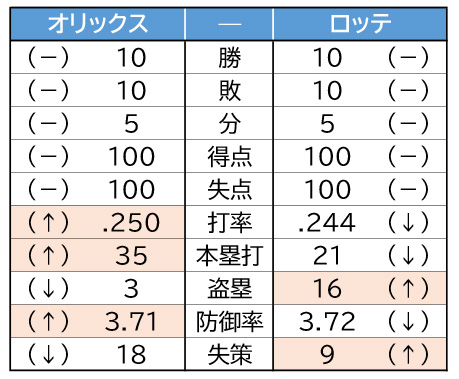 今季の対戦成績は10勝10敗5分、得失点も100点ずつと全くの互角だが、京セラドーム大阪ではロッテが5勝2敗3分とリードしている。