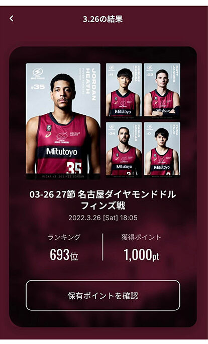 そして試合が行われるとそれぞれの選手の活躍度と倍率を掛け合わせ、予想した選手ごとにスコアが計算される。その合計が、参加ユーザーの中でランキングになる。そのランキングで、上位は10000ポイントなど、順位ごとに設定されたポイントを得られる。このポイントは4月以降交換制度が整えられ、新しいNFTカードや選手のサイン入りグッズと交換できるようになるそうだ。