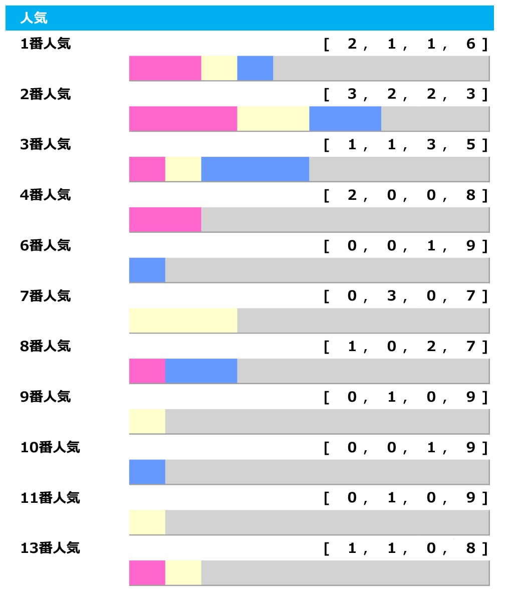 3番人気は【1-1-3-5】と複勝率50.0%を誇る。ただし、優勝回数を見ると4番人気が2回、2着も7番人気が3回と、やはり中穴の台頭が目立つ。データからは2番人気を軸に、相手には中穴を組み込むのがセオリーとなる。