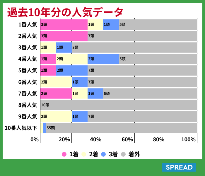 ここでは予想のヒントになる過去10年データ(※2018年は開催されなかったので11年からの集計)をもとにした「人気傾向」と過去5年データ(※出走予定の種牡馬かつ2016年からの集計)をもとにした「血統傾向」を紹介していく。