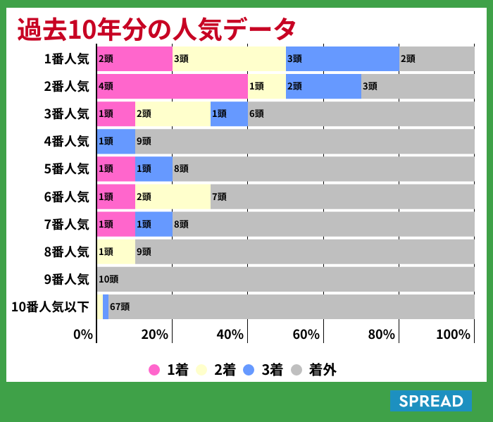 ここでは予想のヒントになる過去10年データをもとにした「人気傾向」と過去5年データ(※出走予定の種牡馬)をもとにした「血統傾向」を紹介していく。