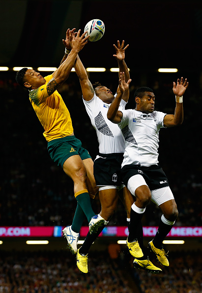 2枚目は、2015年のW杯でオーストラリア代表イスラエル・フォラウ選手と、フィジー代表メトゥイセラ・タレブラ選手、アサエリ・ティコイロトゥマ選手が空中で接戦を演じている様子を撮影したもの。2人を相手にボールを勝ち取るフォラウ選手の空中戦の強さを捉えている。