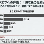 王者シェイドゥラエフに対する評価は圧倒的に高く、畏敬の念に満ちた投稿が大半を占めた。最も多かったのは「UFC級評価」で約50件、「強さへの畏怖」が約23件となっている。