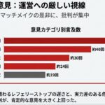 RIZIN運営に対しての投稿に目を向けると、「レフェリー批判」が約56回と最も多く、続いて「マッチメイク批判」が約40回となった。レフェリーのストップタイミングの遅さに対する批判が目立ち、「榊原氏『いいタイミングで止めたなと思った』これ言っちゃうのか。相手側のコーナーでバックからタコ殴りにされてる選手を守れるのはレフェリー(大会運営)だけなのに」との厳しい指摘もあった。