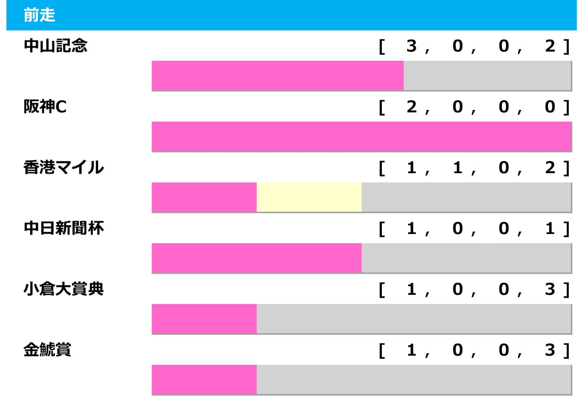 各路線から勝ち馬が出ているが、最多となる3勝を挙げているのが前走・中山記念組。勝率60.0%で昨年は出走馬がいなかったが、2024年のソーヴァリアントは7人気5着と人気以上の成績で、2023年はシュネルマイスターが優勝。好走確率は高く、今年該当馬シャンパンカラーは穴妙味もあり、要注意だろう。