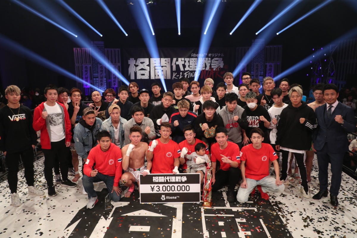 会場が騒然とする中、ゲーオーズが『格闘代理戦争 K-1 FINAL WAR』優勝。優勝賞金300万円とK-1グループデビューを勝ち取り、歓喜に湧いた。