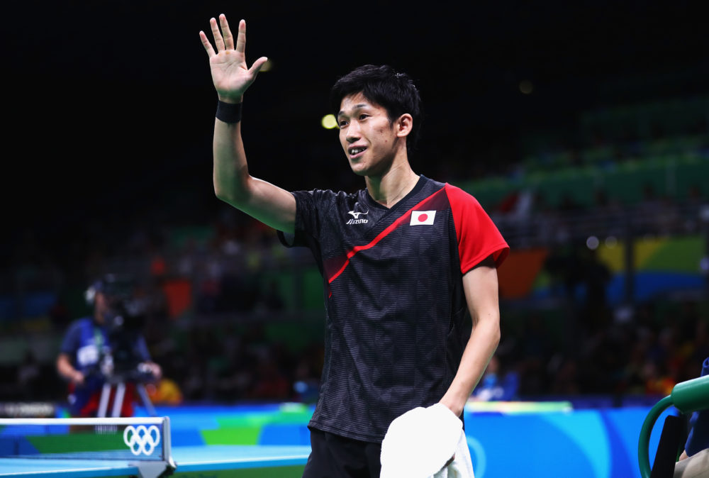 RIO DE JANEIRO, BRAZIL - AUGUST 13: Maharu Yoshimura of Japan celebrates after winning match point during the Table Tennis Men's Team Round One Match between Japan and Poland during Day 8 of the Rio 2016 Olympic Games at Riocentro - Pavilion 3 on August 13, 2016 in Rio de Janeiro, Brazil. (Photo by Ryan Pierse/Getty Images)