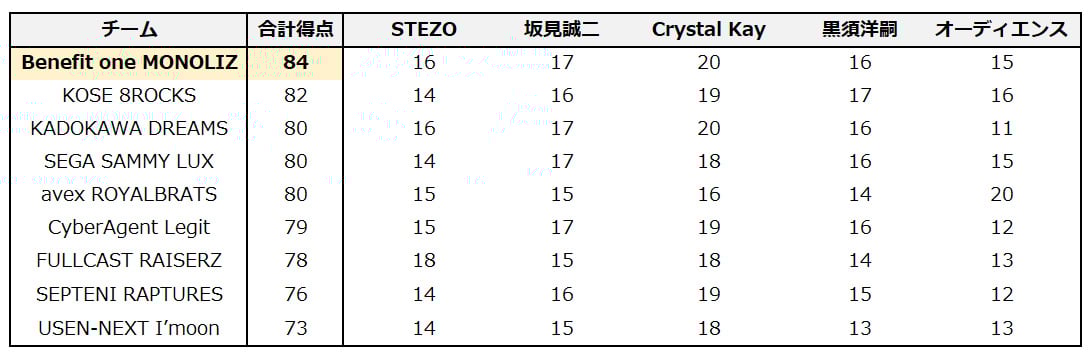 ROUND.4は過去3戦でいずれも下位(9位→9位→7位)と苦しんでいたBenefit one MONOLIZが84点を記録し初勝利を記録した。