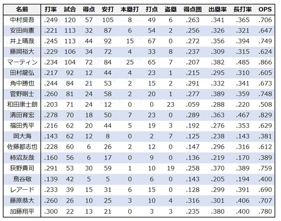 その他、すでに来日済みのマーティン、レアードの両外国人が安田の脇を固め、下位には中村奨吾、井上晴哉、藤岡裕大など、実績のある中堅選手が並ぶ。熾烈なのが外野争いで、荻野貴司、菅野剛士、和田康士朗に、昨季FA移籍も不本意な成績に終わった福田秀平など、藤原の定位置奪取への道は簡単ではない。