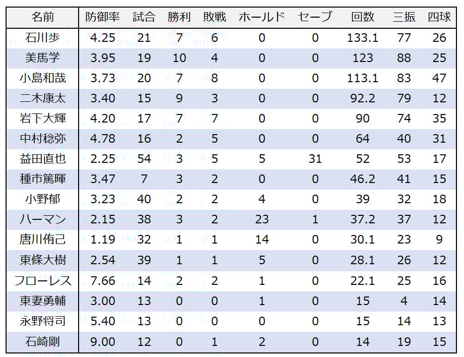 先発陣は石川歩、美馬学の二本柱に、近年は若手投手の台頭が目立つ。2019年に8勝を挙げた種市篤暉はトミー・ジョン手術で今季は間に合いそうもないが、初の開幕投手が内定した二木康太を筆頭に、小島和哉、岩下大輝、中村稔弥など、伸び盛りの選手が揃う。他にも有吉優樹や大嶺祐太など、ケガから復帰した実績組にも注目だ。