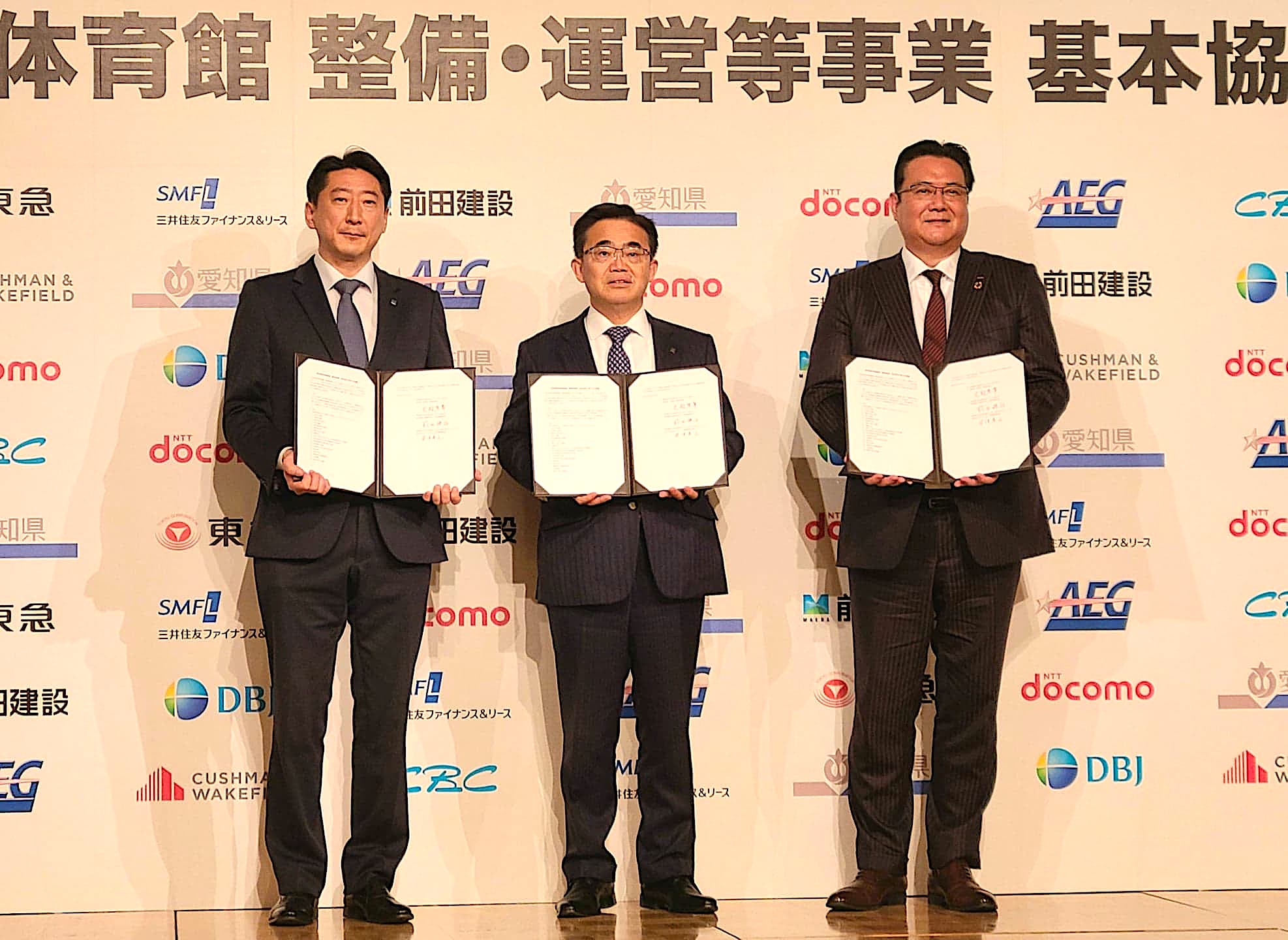 調印式には、愛知県大村秀章知事、NTTドコモ井伊基之社長、前田建設前田操治社長らが出席し、新しいに愛知県体育館に関する基本協定を締結した。