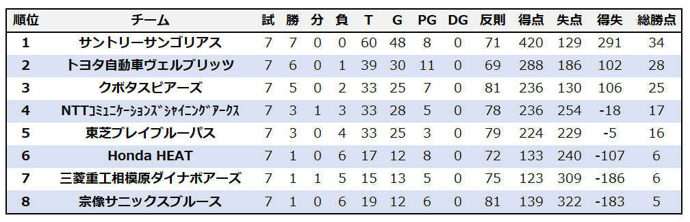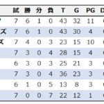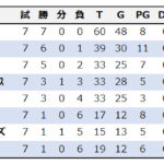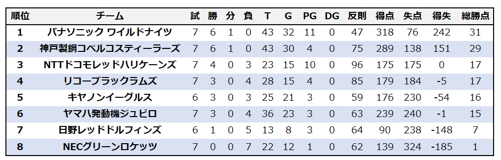 ホワイトカンファレンスはパナソニック ワイルドナイツが首位、神戸製鋼コベルコスティーラーズが2位となったが、勝ち点差2という大激戦だった。パナソニックはリーグ最少失点、得点もリーグ首位の318と完璧な数字を残した。特に失点数76は16チーム唯一の100以下と、ディフェンスの強さを証明。また、反則47も飛び抜けて少なかった。