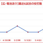 竜のリードオフマンは12試合連続ヒットと量産態勢に入っており、左右別で見ても左が.308、右が.308と高打率を記録している。次戦以降も1番打者としてチームに勝利に導く一打を放ちたい。