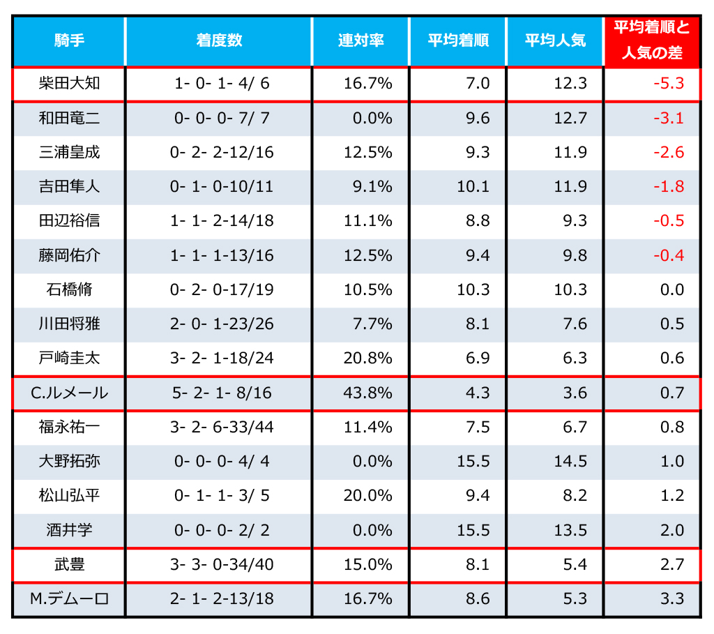 着順と人気のバランスが優れ、高い連対率を記録しているのが、戸崎圭太騎手、C.ルメール騎手の2名です。