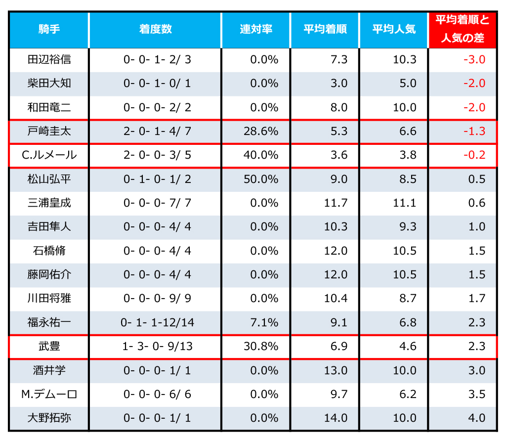 他にも2013年のヴィクトリアマイルでは5番人気のマイネイサベルを3着に導いており、対象期間の6鞍全てで人気よりも上の着順を記録。着順と人気のバランスがとても優れた騎手と言えます。
