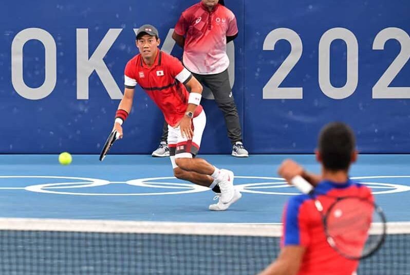 東京五輪のテニス男子シングルス準々決勝が29日、有明テニスの森で行われ、リオ五輪銅メダルの錦織圭(日…