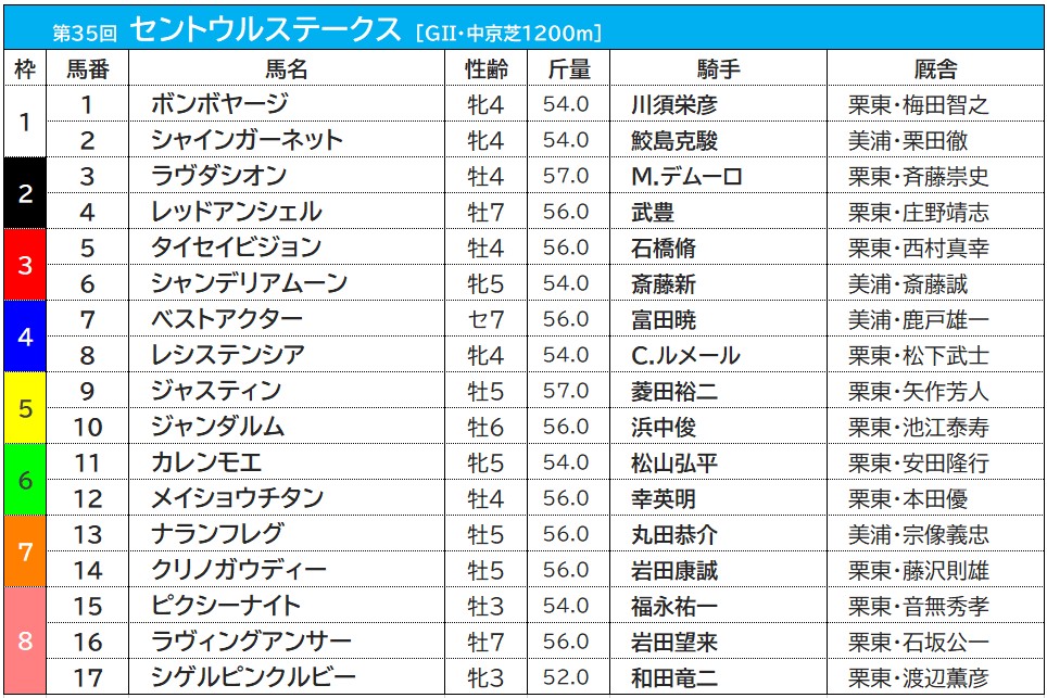 第35回・セントウルS(GII、芝1200m)の枠順が10日、発表された。