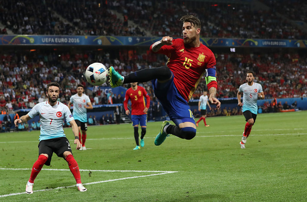 NICE, FRANCE - JUNE 17: Sergio Ramos of Spain controls the ball during the UEFA EURO 2016 Group D match between Spain and Turkey at Allianz Riviera Stadium on June 17, 2016 in Nice, France. (Photo by Ian MacNicol/Getty Images)