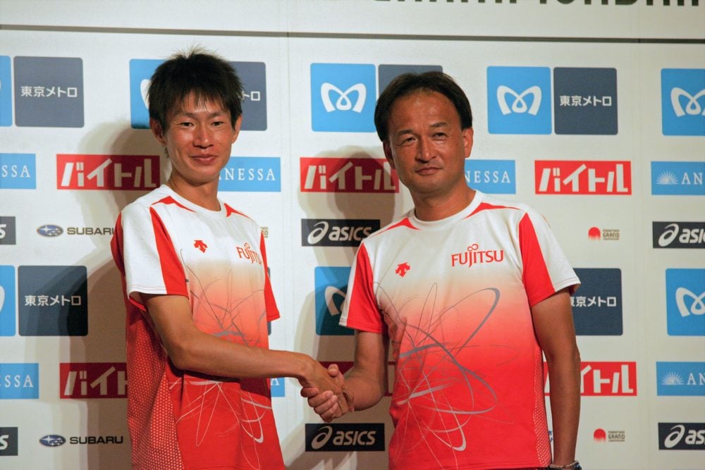 中村匠吾選手と富士通陸上競技部の福嶋正監督 撮影=山口和幸