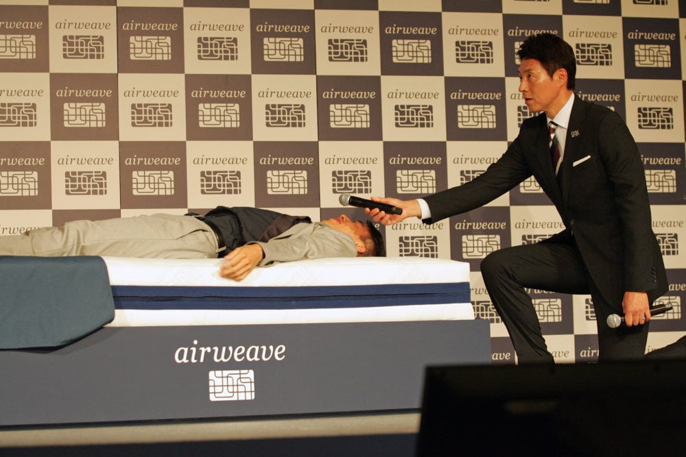 自分用に最適化されたベッドの寝心地を錦織選手にインタビューする松岡さん 撮影=山口和幸