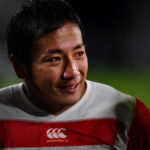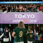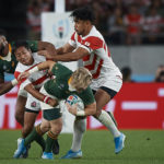 CHOFU, JAPAN - OCTOBER 20: Faf de Klerk (C) of South Africa is tackled by Yutaka Nagare of Japan during the Rugby World Cup 2019 Quarter Final match between Japan and South Africa at the Tokyo Stadium on October 20, 2019 in Chofu, Tokyo, Japan. (Photo by Pablo Morano/MB Media/Getty Images)
