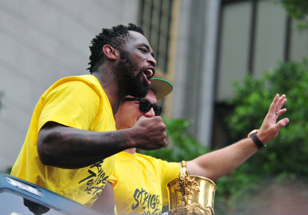 デクラーク、国旗柄のパンツを再び披露 ラグビー南アフリカ代表が優勝パレード