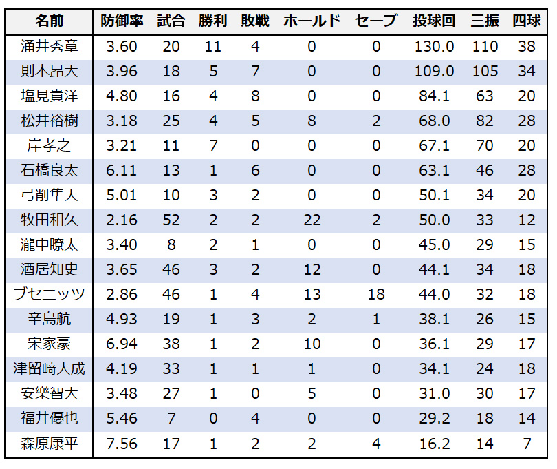 楽天の主な投手の昨季成績