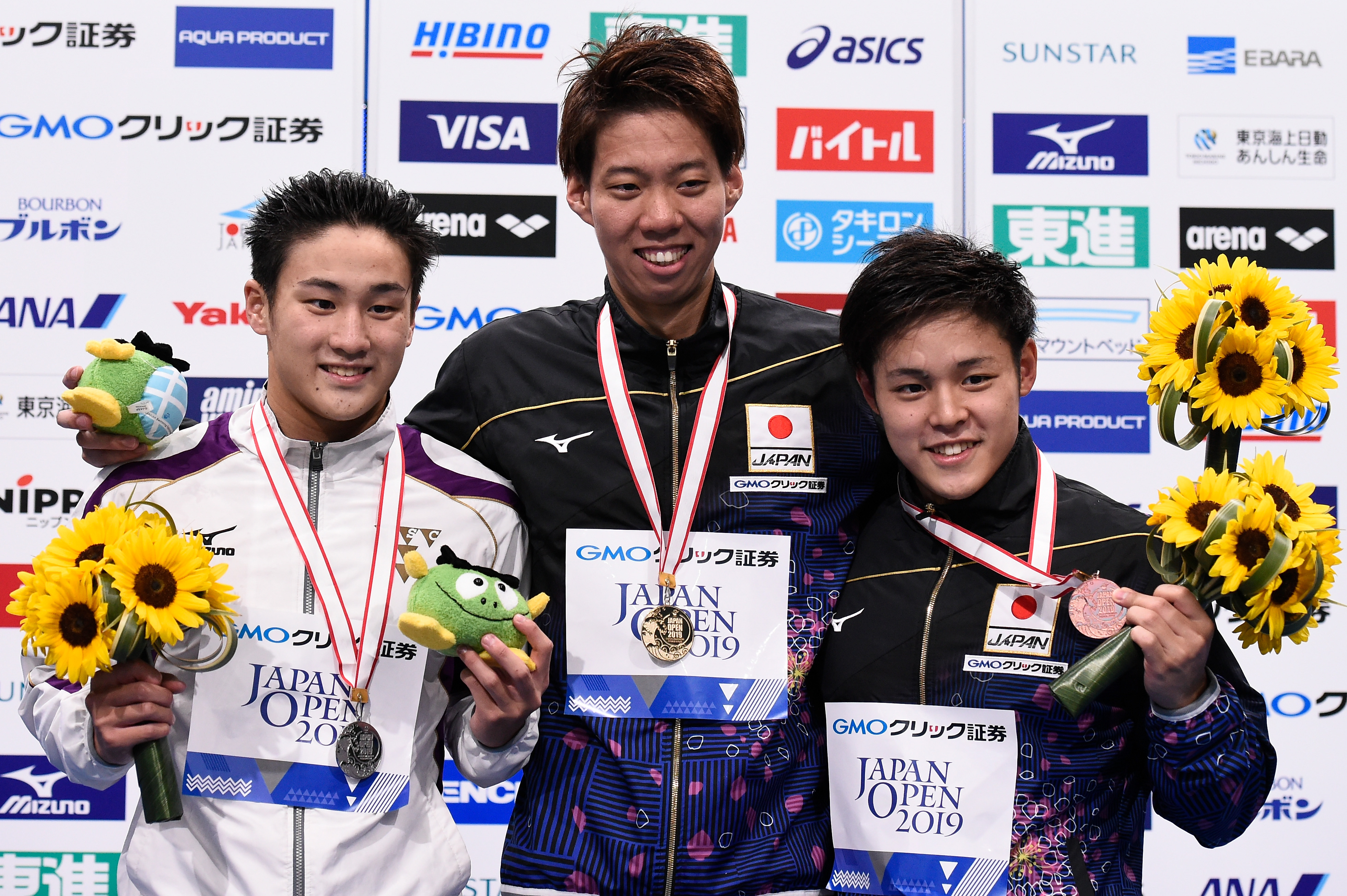 TOKYO, JAPAN - JUNE 02: (L-R) Silver medalist Syoma Satou of Japan, gold medalist Ippei Watanabe of Japan and bronze medalist Kazuki Kohinata of Japan pose during the medal ceremony of the Men's 200m Breaststroke Final on day four of the Swimming Japan Open at the Tokyo Tatsumi International Swimming Center on June 02, 2019 in Tokyo, Japan. (Photo by Matt Roberts/Getty Images)