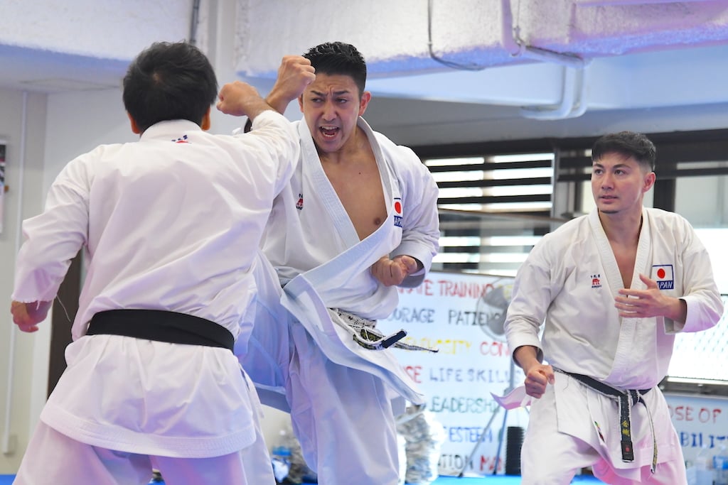 団体形で共に戦ってきた金城新(右)、上村拓也(左)と共に稽古を重ねる喜友名諒 撮影:長嶺真輝