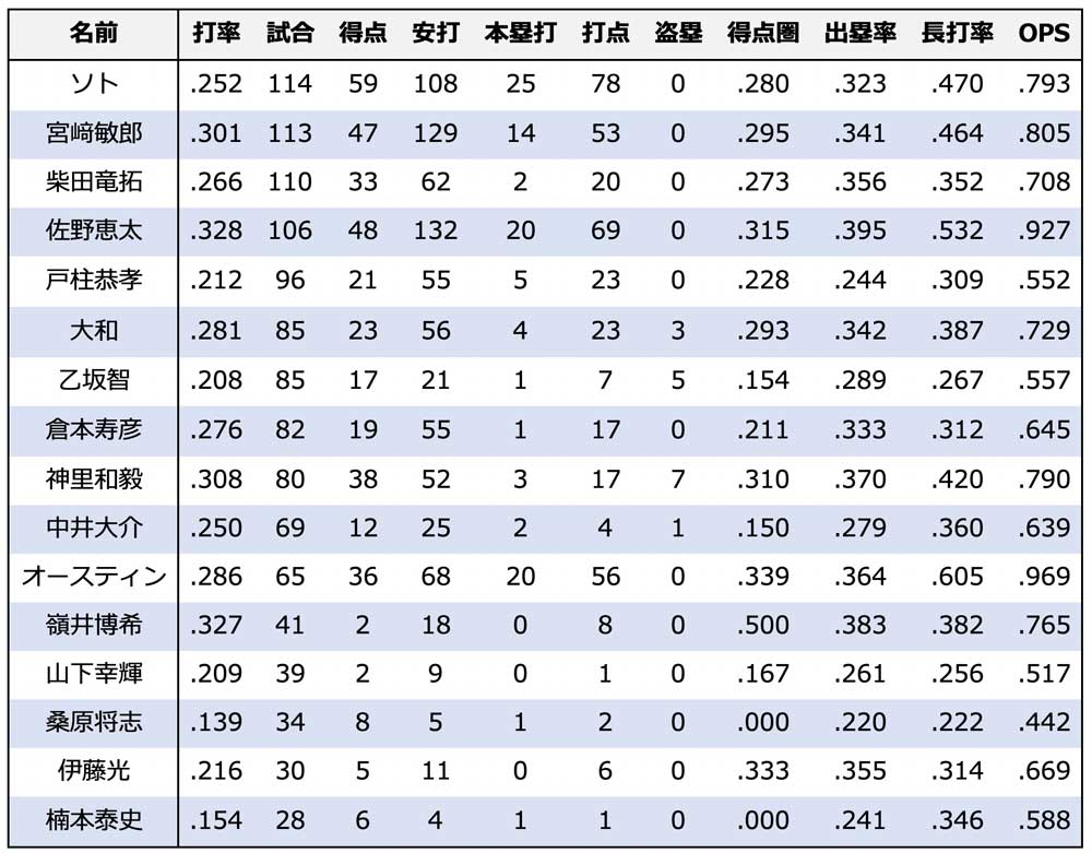 DeNAの主な野手の昨季成績